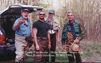 01 May 1999. Lured by the promise of low, clear water and a prolific Hendrickson hatch, the intrepid Hell's Anglers met on the WB Delaware. Thanks to Gerry and Tim we escaped semi-fishless.