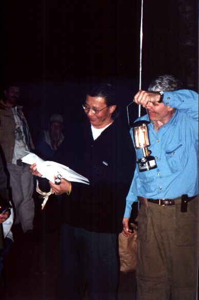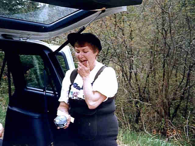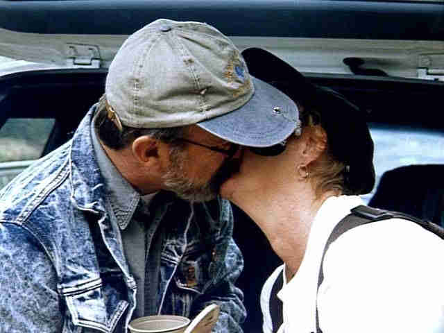 On the banks of the Ausable River on 01 June 1997, Jim Tefft proposed marriage to his bestest fishing buddy, Pat McGlory. He did it by tying an engagement ring to the tippet of Pat's flyline along with a scrap of paper featuring the words "Will you marry me?", which she discovered as she was rigging up to go fishing. On hand to witness this bit of FF@ romance were Luis Nasim and myself. And the camera doesn't lie, as the next 3 photos will attest: