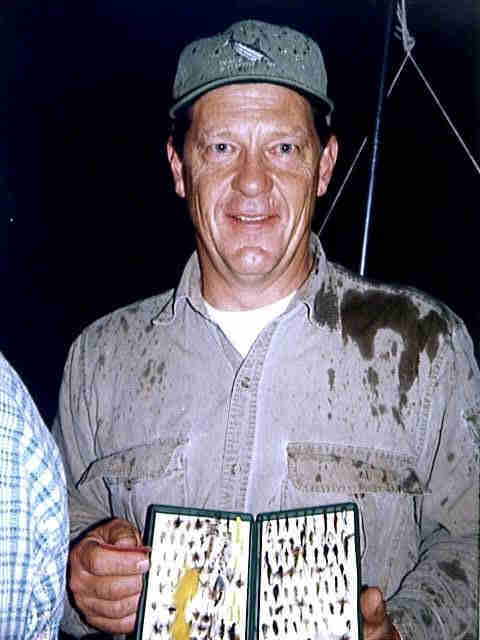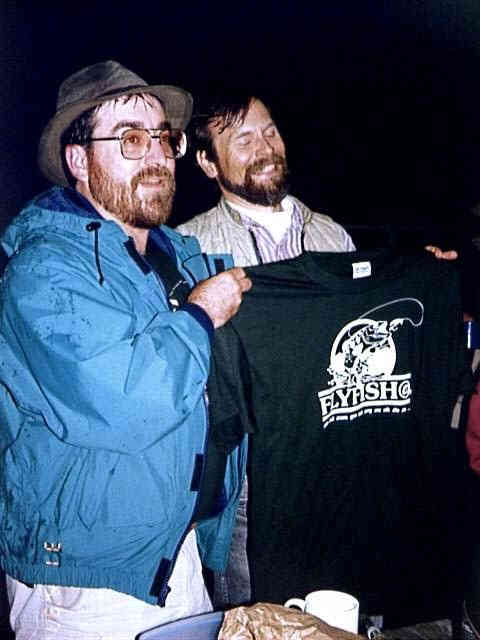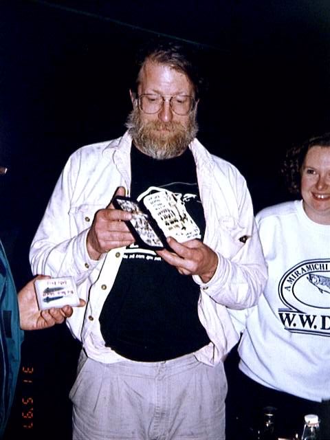 OK, that's the big news from Lake Placid Clave '97, but it's not the only news. We held two raffles during the Saturday night party, the usual silly raffle and a special raffle to raise money for the FF@ Youth Fund. The fund was established to support tuition for youth fly fishing/conservation camps. We had wonderful donations from many generous FF@ers. Notably we had 2 donated fly boxes that were filled with FF@ flies that were also donated. We also had a special print donated by artist Stephen Di Cerbo. The raffle raised over $200 for the youth fund. Here's Bill Barnard winning the Fox Box donated by Richard Frank: